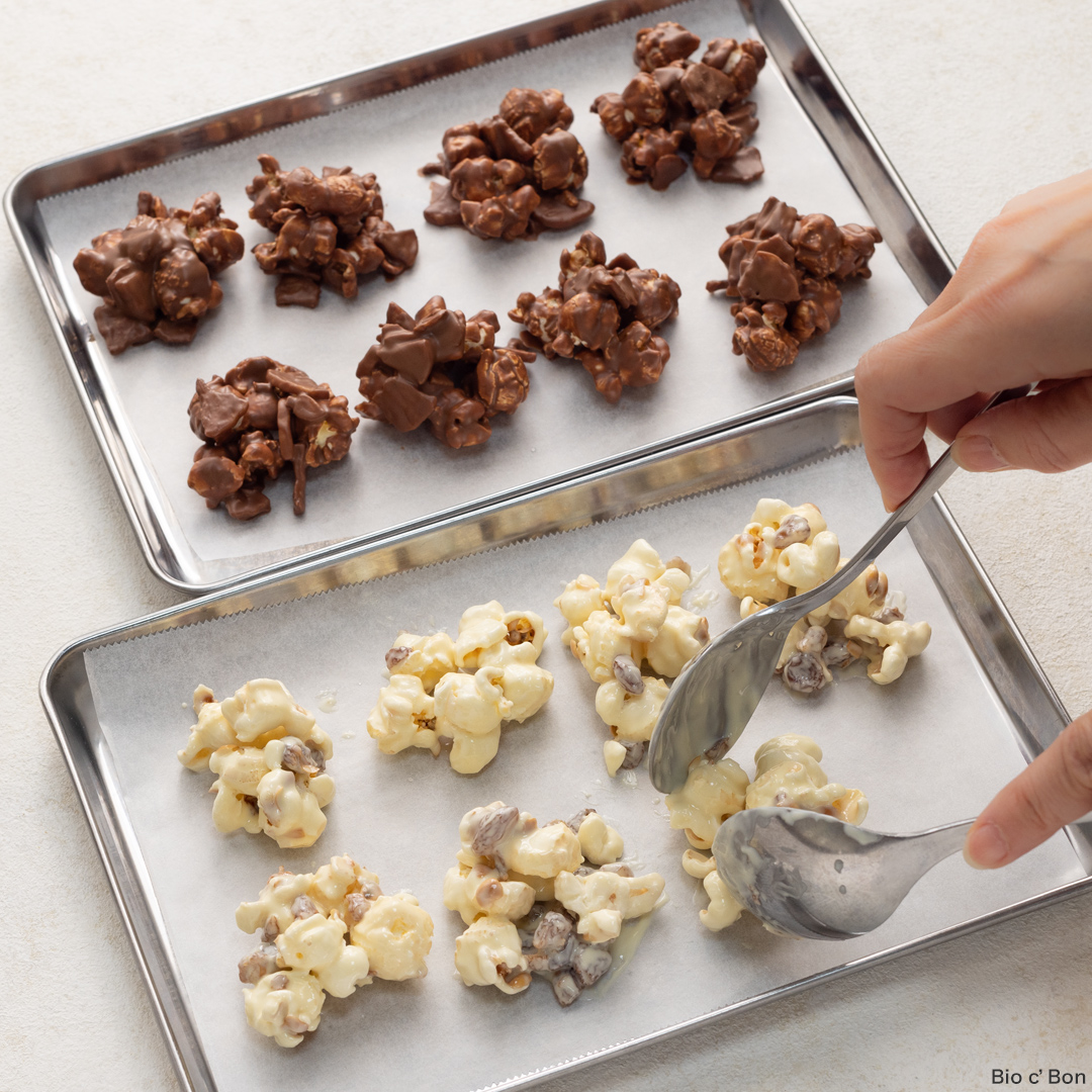 - [ホワイトチョコレーズン味]同様に湯煎したホワイトチョコに残りのポップコーンとレーズンを加えて、一口大にして冷やす