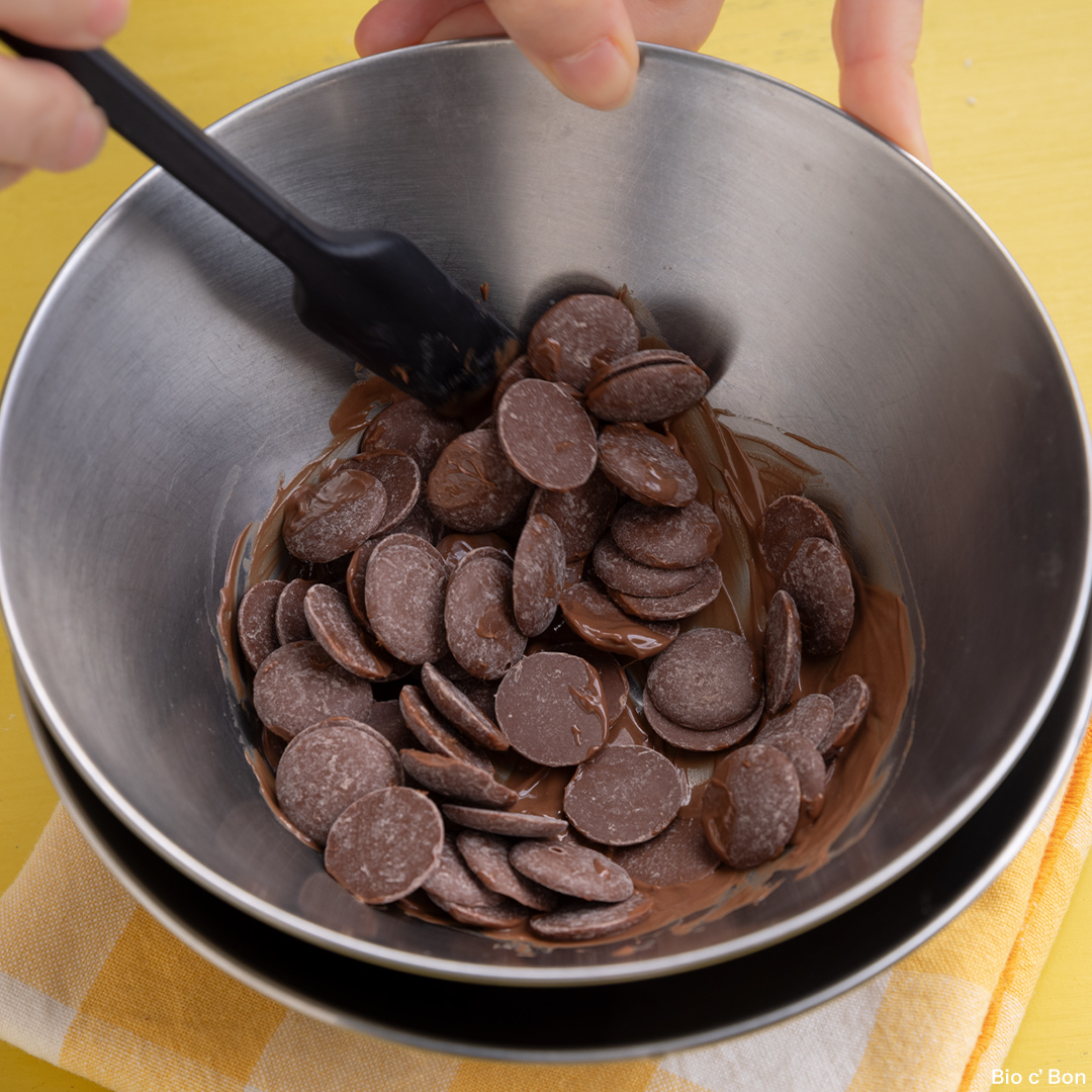 - チョコレートをボウルに入れ、50℃程度の湯せんにかけ、ゆっくりかき混ぜながら溶かす。