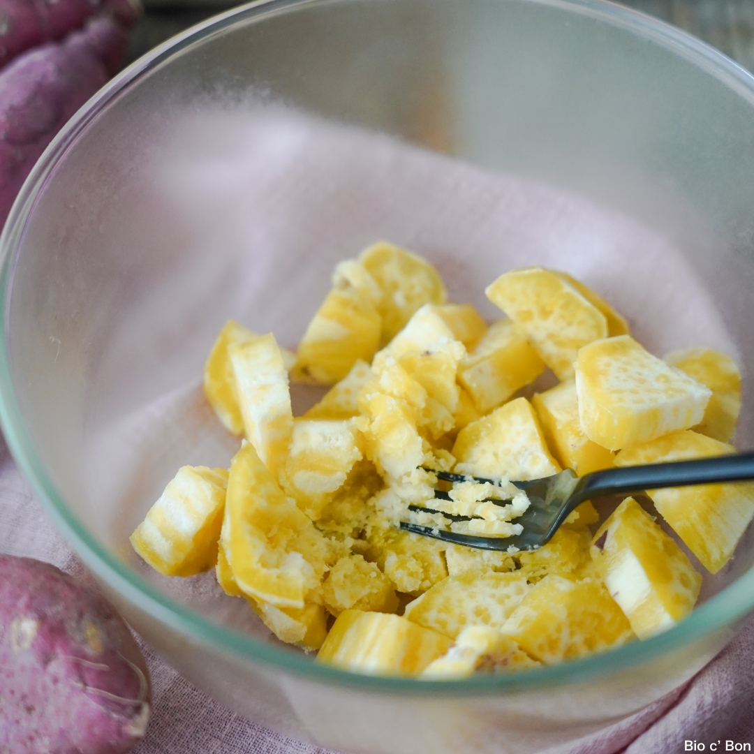 - 加熱して皮を剥いたさつまいもを熱いうちに潰し、メープルシロップ・溶かしバターを混ぜる。