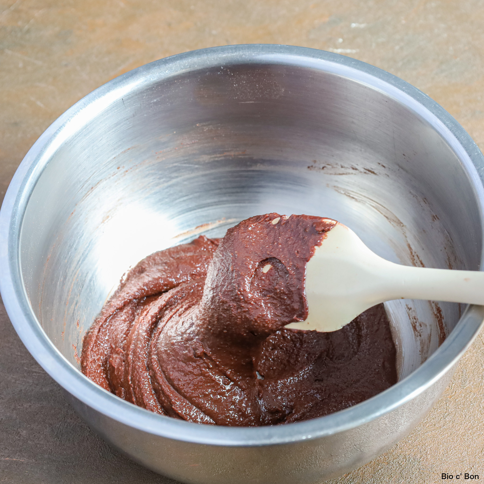 - ❶にBの材料を加え、ゴムベラでしっかりと混ぜる。全体がよく混ざったらベーキングパウダーを加え、さらによく混ぜる。