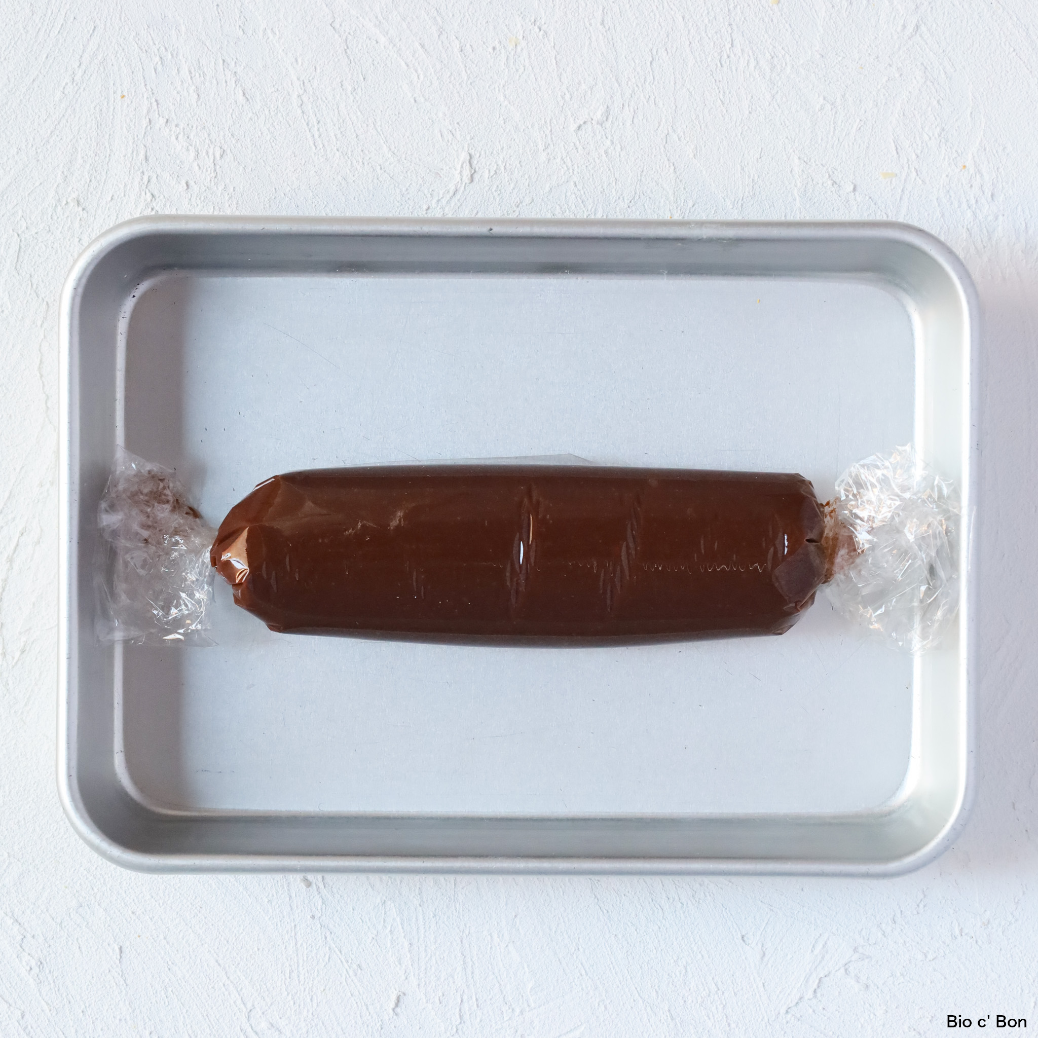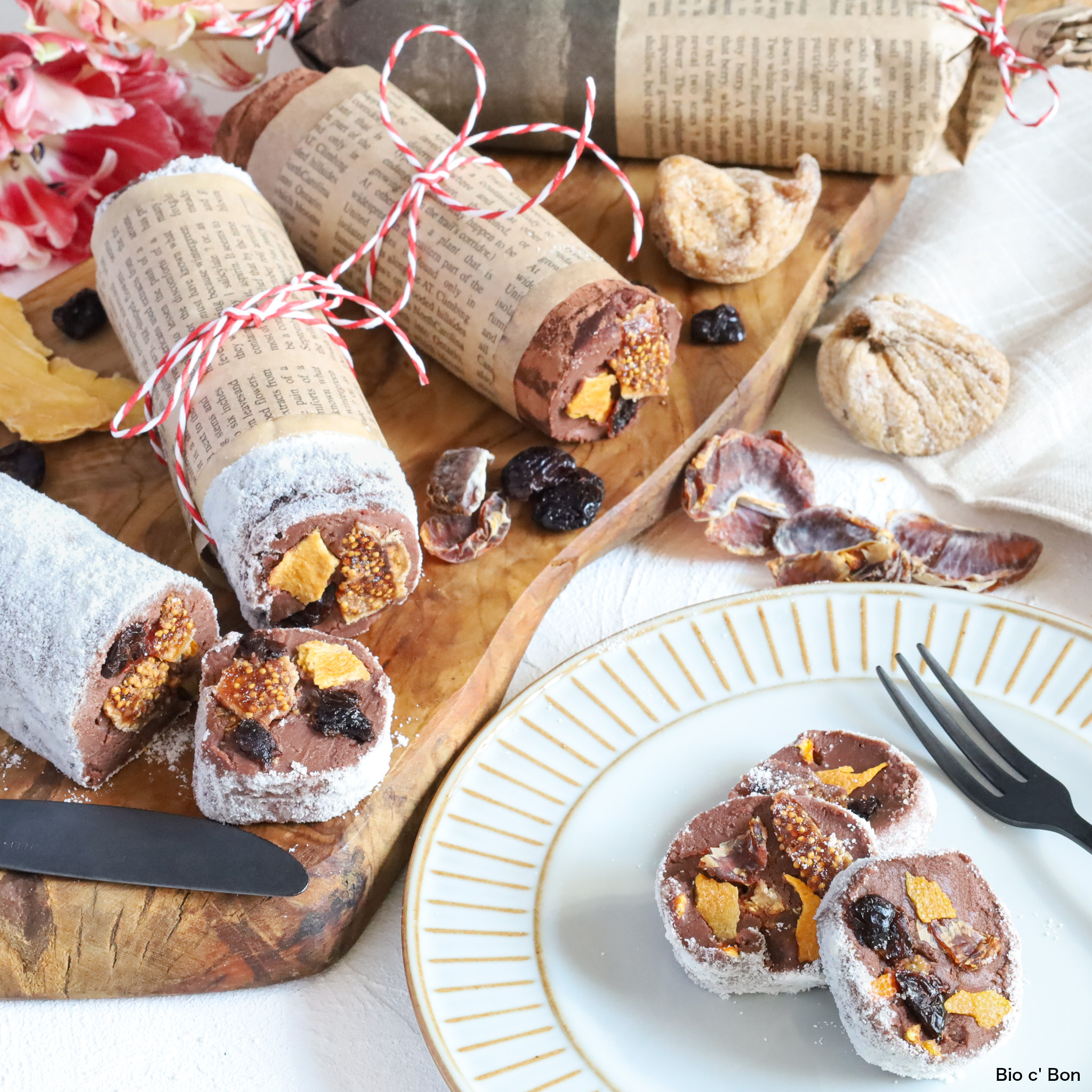 - ❸をラップに移し、その上に小さくカットしたお好みのドライフルーツをのせる。チョコを半分に折り、筒状に成型して冷蔵庫で30分程冷やす。