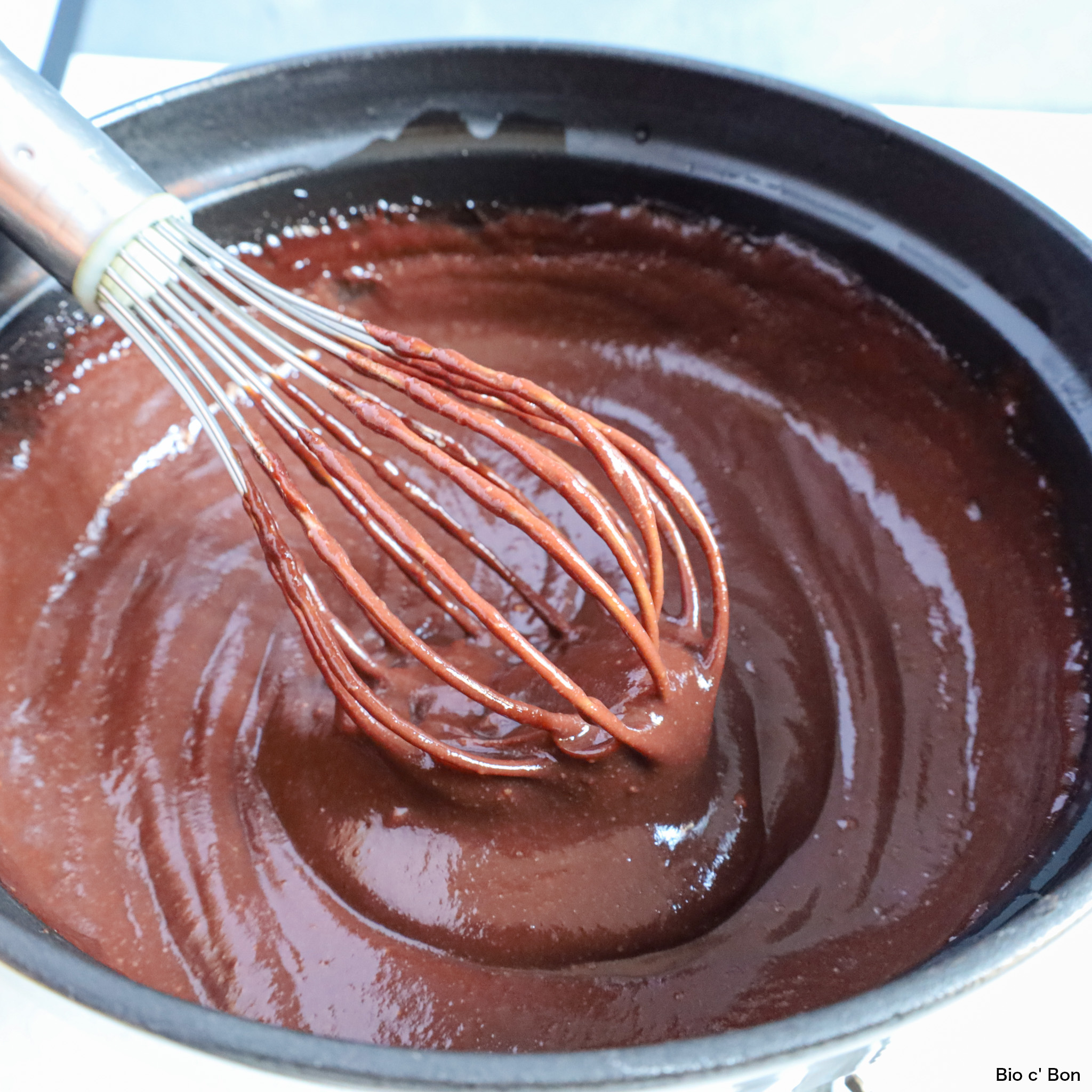 - ホイッパーで混ぜながら弱火にかけ、ツヤが出て全体に粘りが出てまとまったら火を止め、ラム酒を加えてよく混ぜる。