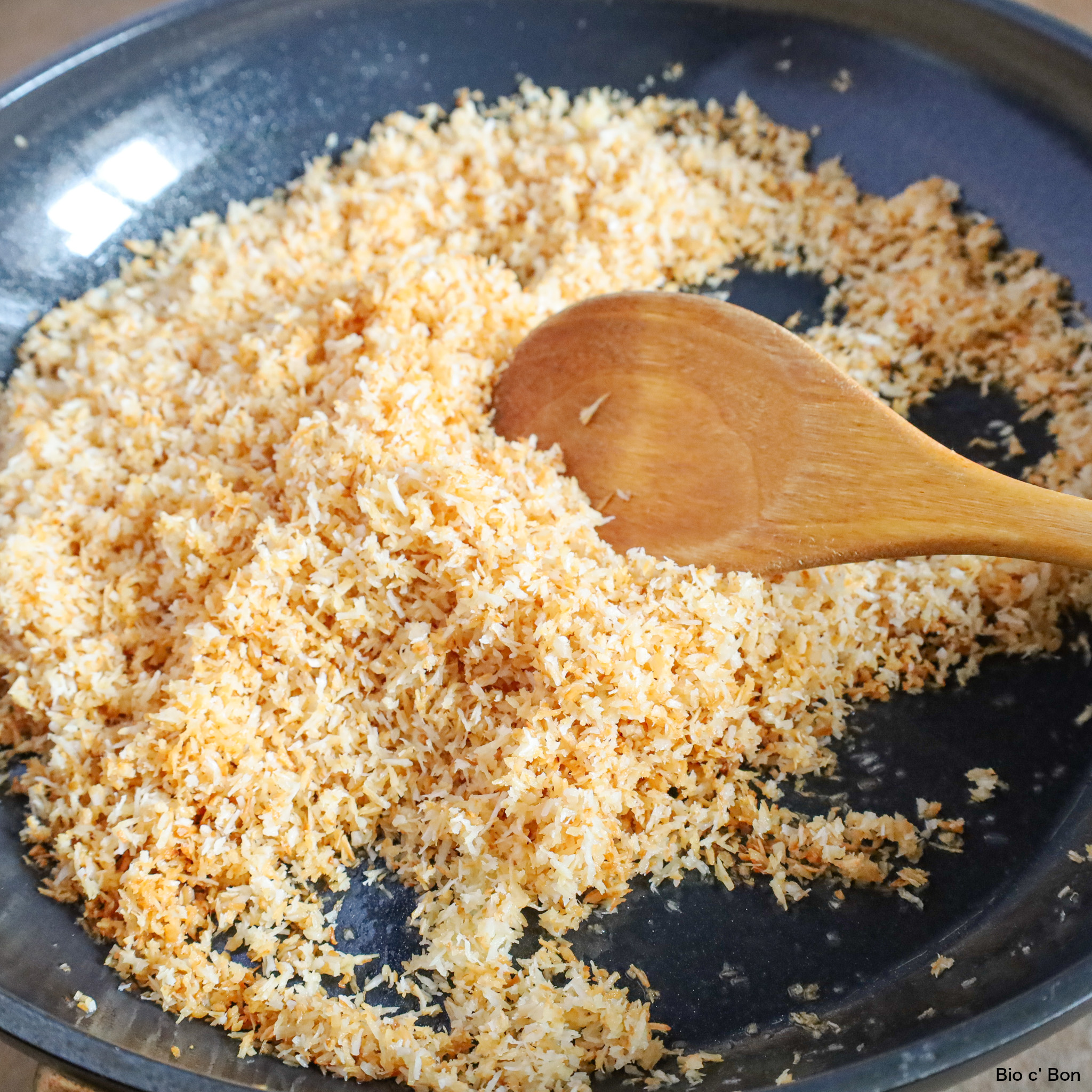 - フライパンに無塩バターを入れ、中火にかける。バターが溶けはじめたらココナッツフレークとてんさい糖、塩を入れ、全体がきつね色になるまで混ぜる。※焦がさないよう注意