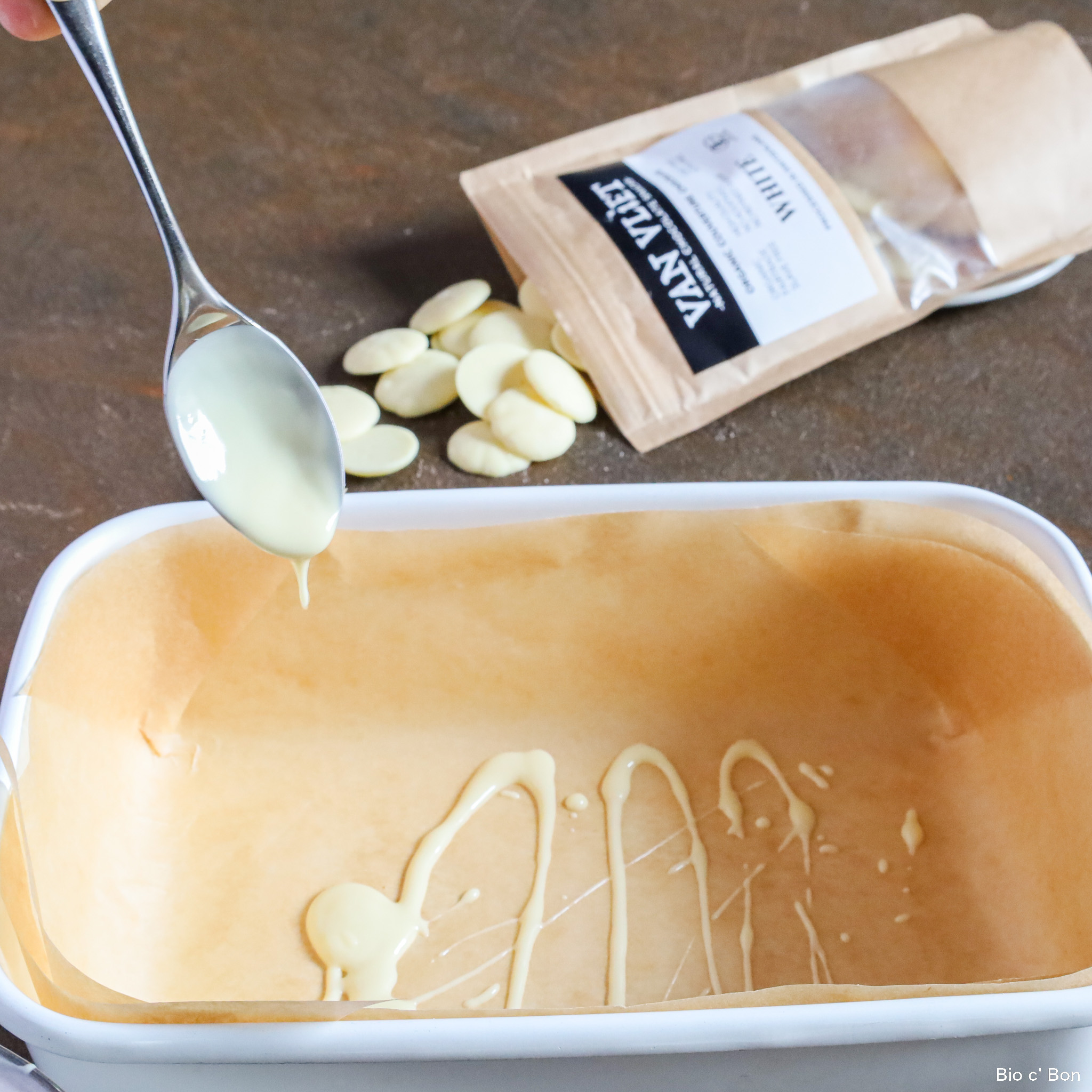 - バットにクッキングペーパーを敷き、溶かしたホワイトチョコレートをスプーンで垂らしてバットの底にラインをかく。
