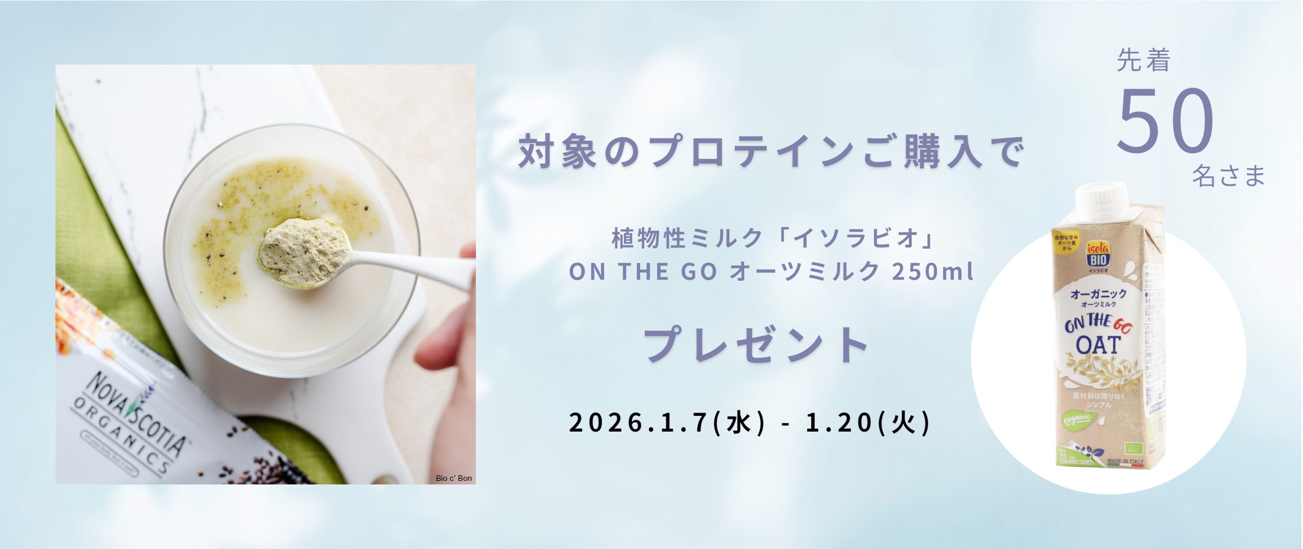 期間中、対象のプロテインをご購入いただいたお客さまに、毎日続けたいプロテイン補給にぴったりなオーガニック植物性ミルク「イソラビオ」をプレゼント!ON THE GOオーツミルクはシンプルな原材料で飲みやすいので、是非プロテインと一緒にお楽しみください。その他、全粒オーツやローストアーモンドなど種類豊富にご用意しておりますのでお好みを見つけてくださいね。
