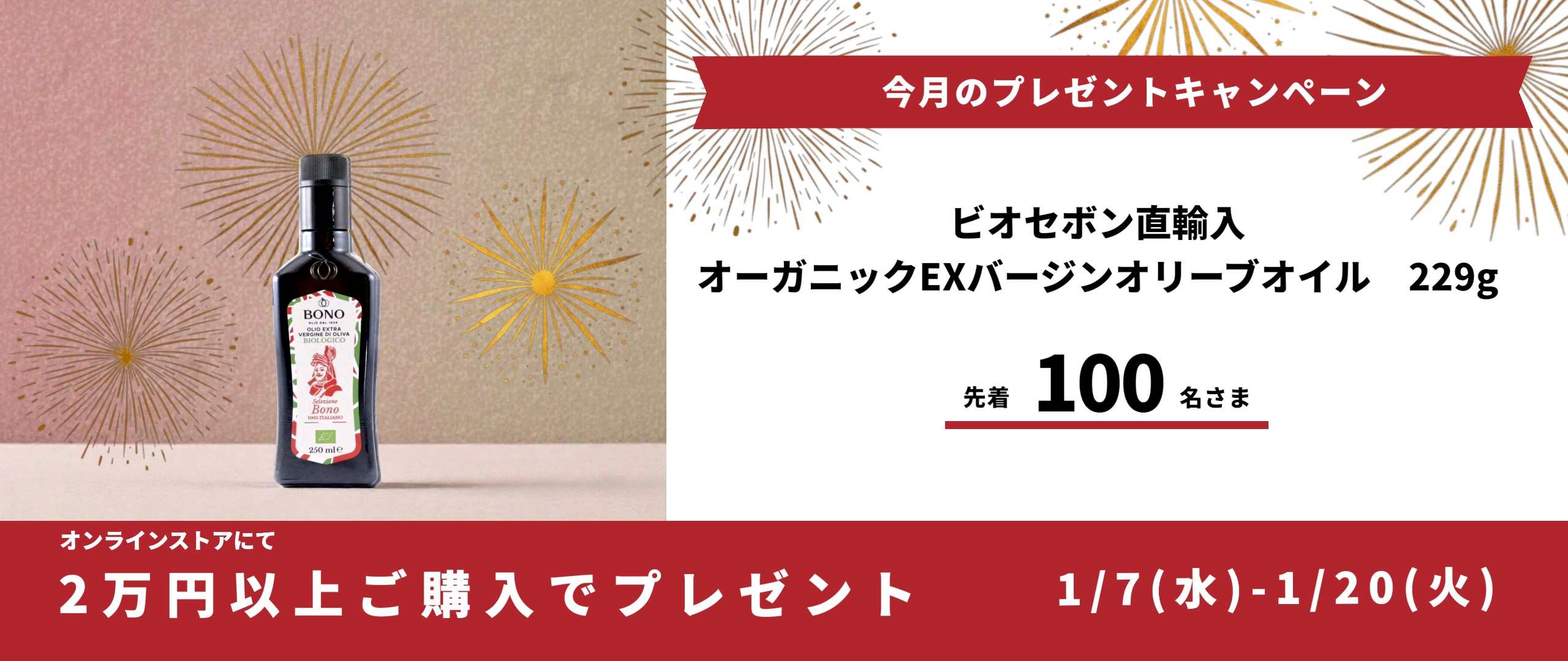 オンラインストアにて2万円(税抜)以上ご購入いただいた先着100名さま限定で、 2025年に実施した「ビオセボン総選挙」で TOP9に選ばれた定番人気の「ボノ」オーガニックEXバージンオリーブオイル(現品)をプレゼント!是非この機会にお買物をお楽しみください。