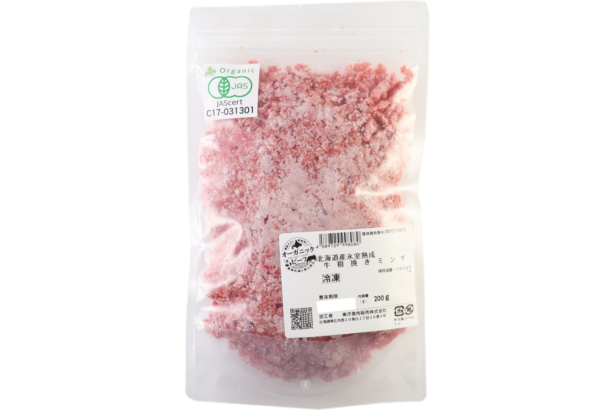 有機牛粗挽きミンチ 200g - 大変希少な北海道産オーガニックビーフを6mmで粗挽き。天然氷の氷室で熟成させた赤身肉は、ジューシーなコクと深い旨味で料理が驚くほどランクアップします。