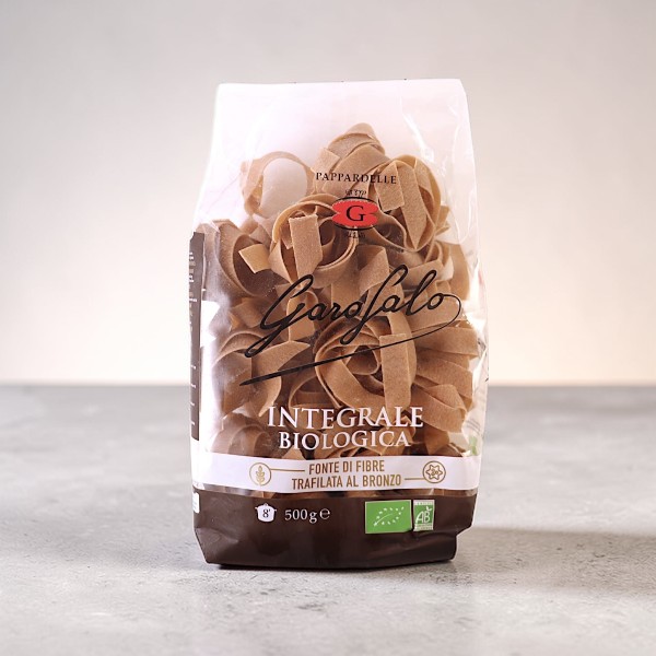 オーガニック 全粒粉パッパルデッレ- 小麦の風味豊かな全粒粉で仕上げた、ガラファロのパッパルデッレ。もっちり食感でソースがよく絡み、濃厚なソースと好相性。