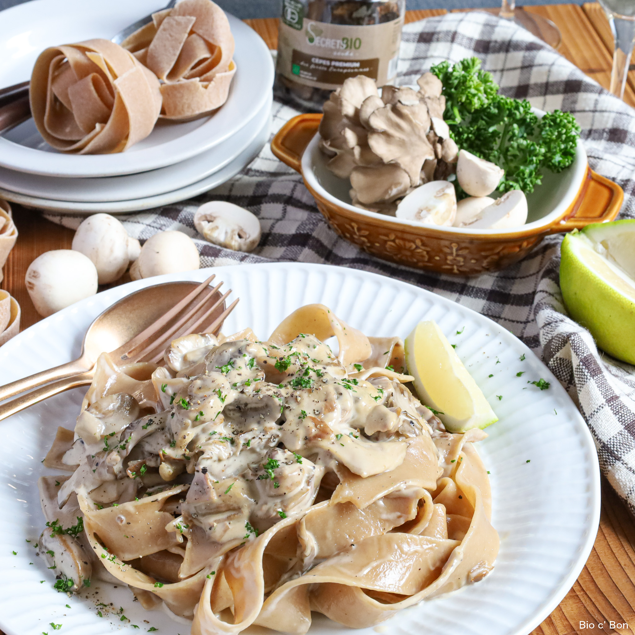 - きのこから水分が出てしんなりとしてきたらポルチーニと戻し汁、生クリームを加え、塩、こしょうで味を整える。