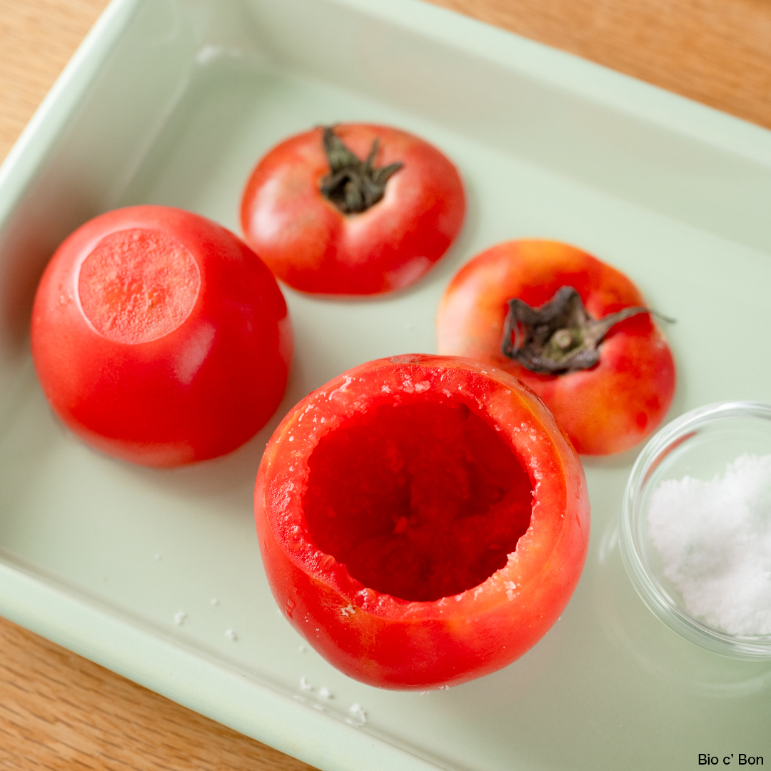 1. トマトは上から1cmほどのところで横に切り、底も薄く切って安定させる。スプーンで中身をくり抜く。トマトの内側に塩(分量外)をふり逆さに置いて余分な水分を抜いておく。