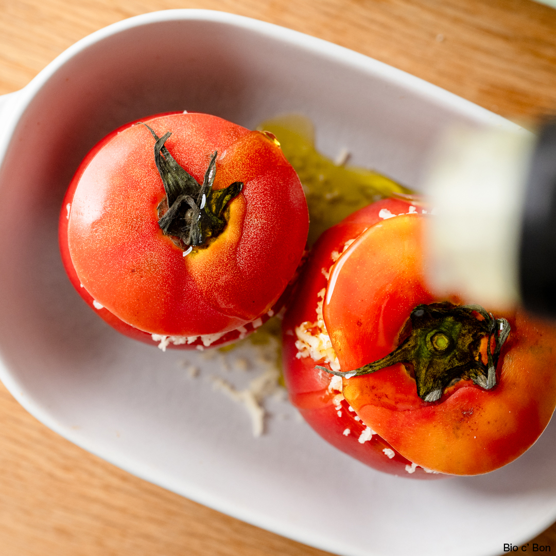 4. 耐熱容器に入れたら、トマト全体にオリーブオイル(分量外)を回しかける。トースターで15分〜20分焼いたら完成!