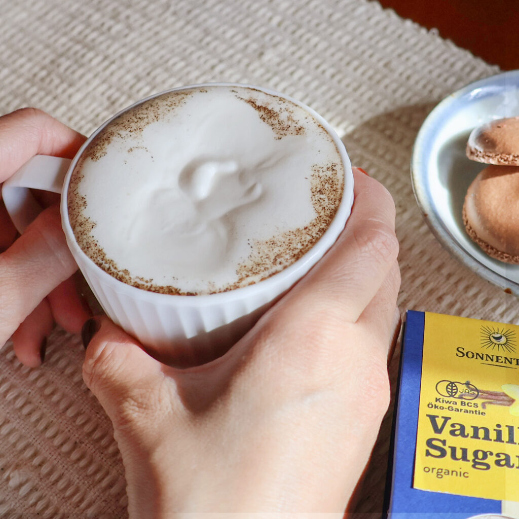 - 牛乳を加えて沸騰しないように気をつけながら中火で温め、バニラシュガーを加えて溶かし、沸騰直前で火を止める。