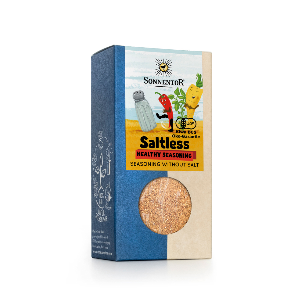 ソルトレスヘルシーシーズニング- 野菜、スパイス、ハーブの力で、塩を加えなくてもおいしく仕上げます。塩分を控える方の強い味方。グリル野菜やサラダに、素材の味をよりいっそう引き立てます。